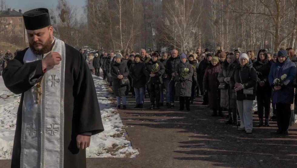 Уруштун курмандыктары үчүн намаз. Буча, 2025-жылдын 24-феврали. Фото Roman Pilipey / AFP / Scanpix / LETA.