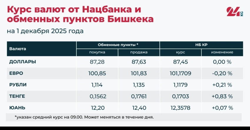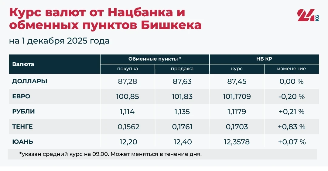 По информации Национального банка Кыргызстана и обменных пунктов Бишкека, наблюдается рост официальных курсов для российского рубля, казахского тенге и китайского юаня, в то время как курс евро немного снизился. Курс доллара остается стабильным.