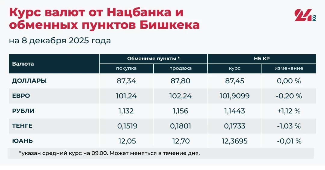 По данным Национального банка Кыргызстана и обменных пунктов Бишкека, курс российского рубля показал рост, тогда как евро, казахский тенге и китайский юань подешевели. Доллар США остался без изменений.