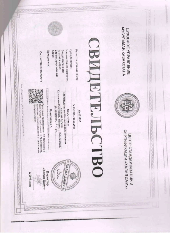 • Сертификат "Халал" от Кыргызстан мусулмандарынын дин башкармалыгы (КР) № KG 2206/0925;