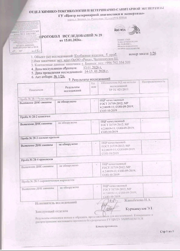 Ассоциация также отметила, что лабораторные исследования, проведенные в аккредитованной государственной лаборатории, не выявили следов свинины в продукции ОсОО "Риха", что подтверждается протоколами испытаний.