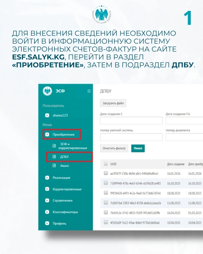 - Для внесения информации следует зайти в систему электронных счетов-фактур на сайте esf.salyk.kg, выбрать раздел "Приобретение", а затем подраздел ДПБУ.