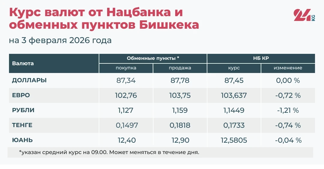 - Средний курс в обменниках: покупка — 87,34 сома, продажа — 87,78 сома.