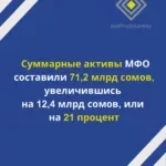 Общие активы микрофинансовых организаций составили 71,2 млрд сомов, увеличившись на 12,4 млрд сомов, что эквивалентно росту на 21 процент.