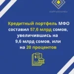 Кредитный портфель организаций составил 57,6 млрд сомов, что на 9,6 млрд сомов больше, или на 20 процентов роста.