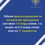 Финансирование, осуществляемое по исламским принципам, достигло 1,8 млрд сомов, что на 0,3 млрд сомов больше по сравнению с предыдущим периодом, что составляет 17 процентов роста.