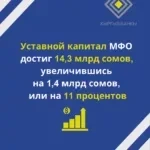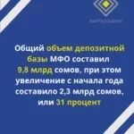 Уставной капитал микрофинансовых организаций возрос до 14,3 млрд сомов, что является увеличением на 1,4 млрд сомов, или 11 процентов. Депозитная база организаций составила 9,8 млрд сомов, увеличившись на 2,3 млрд сомов, что составляет 31 процент роста с начала года.
