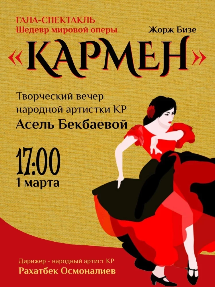 Театрдын маалыматына ылайык, 1-мартта саат 17:00дө "Кармен" гала-спектакли болуп өтөт, анда Асель Бекбаева башкы ролду аткарат.