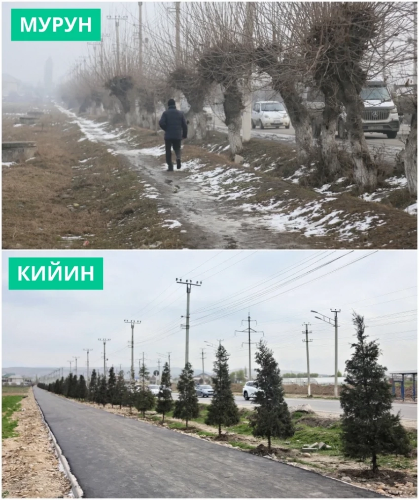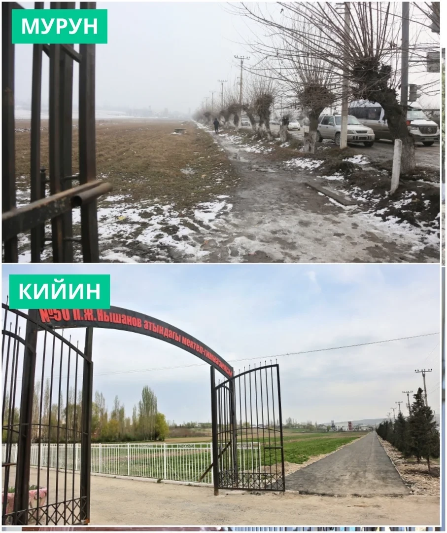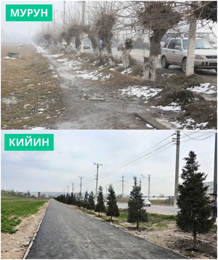 Ош шаарынын мэри Женишбек Токторбаевдин көрсөтмөсүнө ылайык, Бекмамат Осмонов көчөсүндөгү №50 Нышанов атындагы мектептен Мамырова көчөсүндөгү тегерек жолго чейин тротуар, веложол жана жашылдандыруу иштерин жүргүзүүдө.