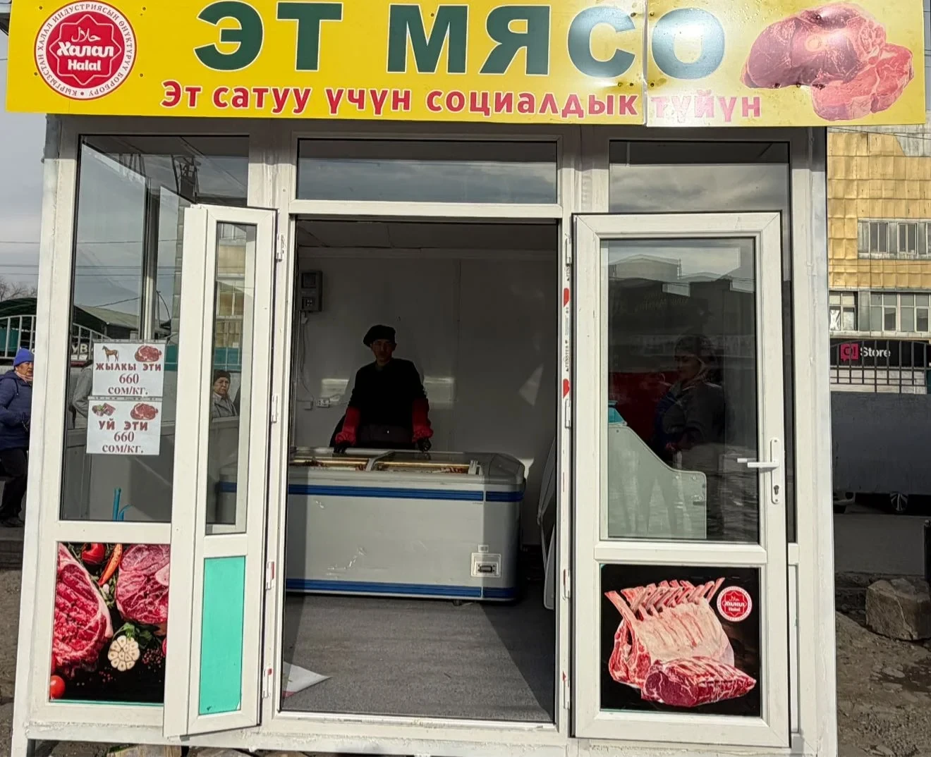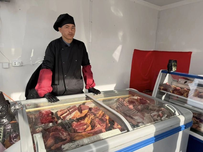 У входа на Ошский рынок открыли соцмагазин мяса по сниженным ценам