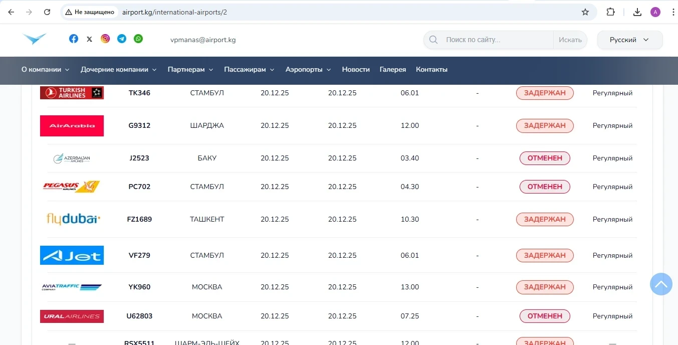 Фото — скриншот с табло аэропорта «Манас»
