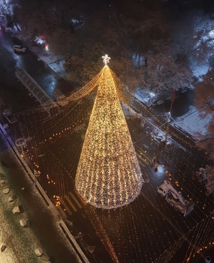По описанию мэрии, "главная новогодняя елка Бишкека 2025 года выполнена в минималистичном стиле. Конструкция имеет традиционную конусную форму и покрыта плотным искусственным еловым материалом темно-зеленого цвета".