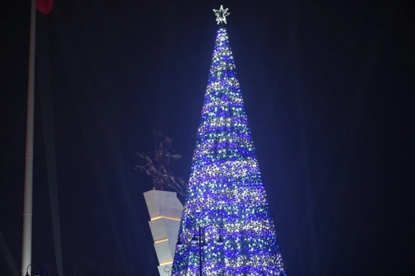 В Токмоке также установлена новогодняя елка, которая украшена длинными гирляндами, создающими атмосферу праздника.