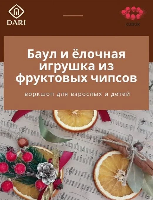 На этом теплом новогоднем воркшопе мы будем собирать праздничный баул и создавать елочные игрушки из натуральных фруктовых чипсов, наслаждаясь атмосферой праздника.