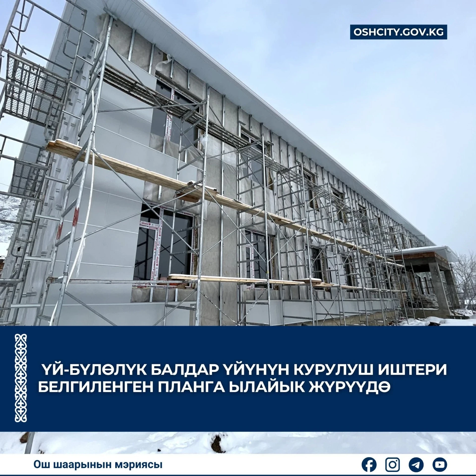 В соответствии с указанием мэра Женишбека Токторбаева, возведение многоэтажного здания, в котором будет 28 квартир, продолжается с целью предоставить жилье детям, которые воспитывались в детских учреждениях «Лотос» и «Алтын Уя».