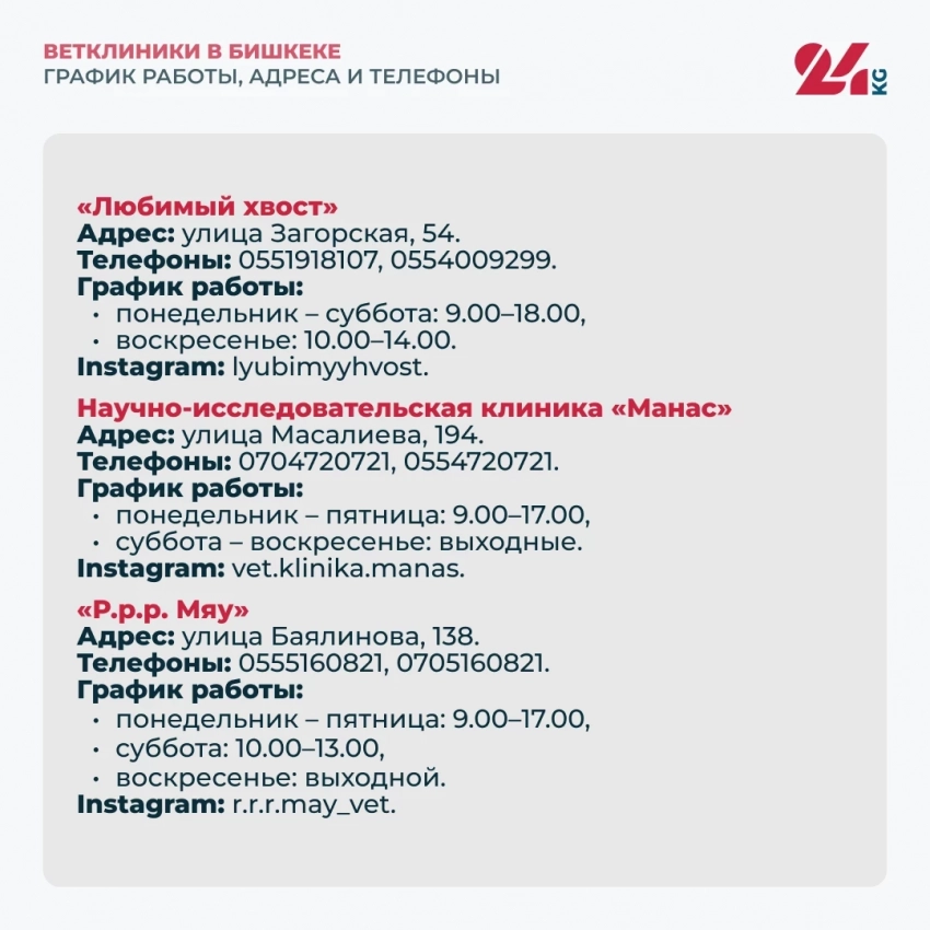 24.kg Бишкектеги ветеринардык мекемелердин тизмесин, даректерин, байланыш номерлерин жана иш убактысын сунуштайт.