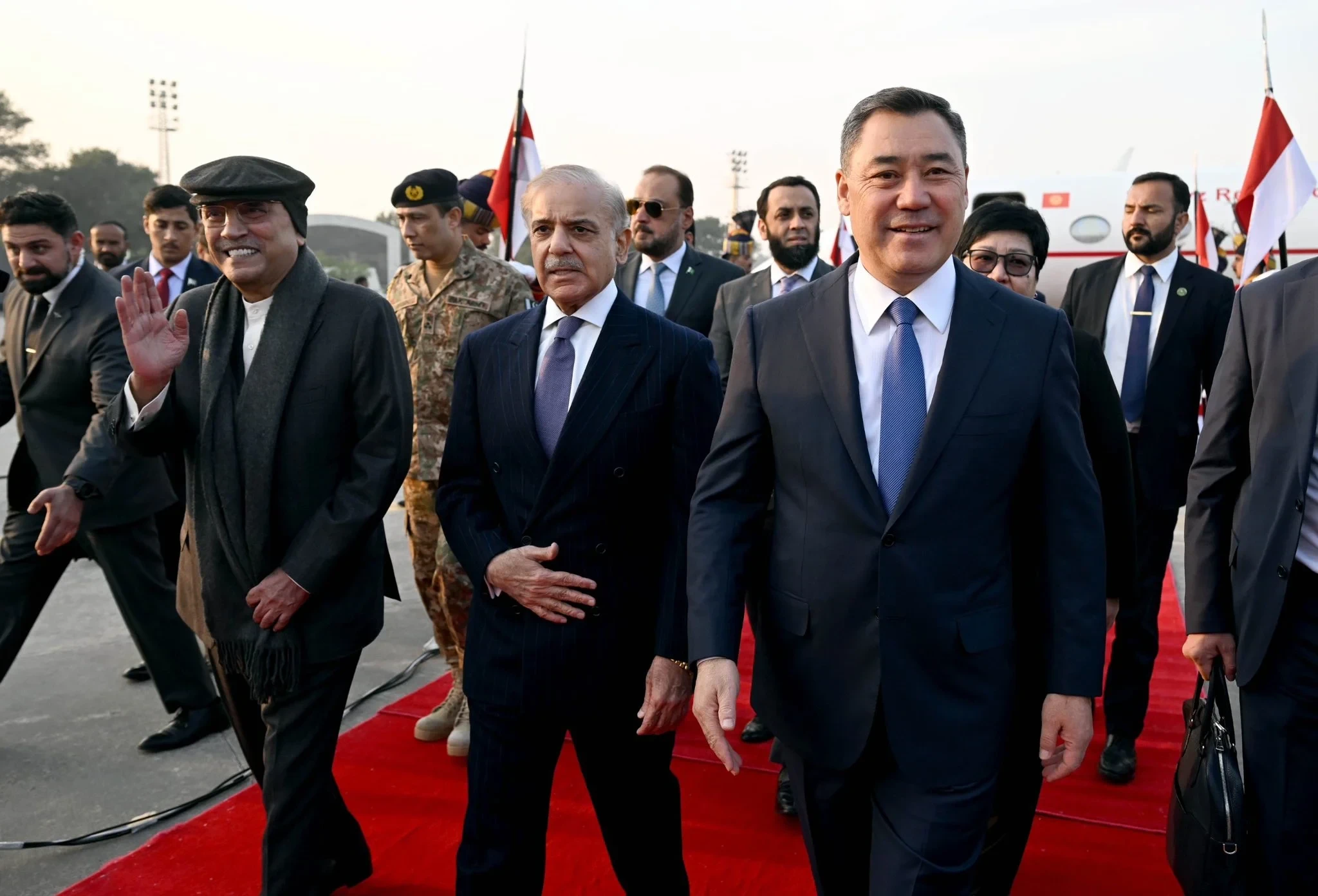 В ходе своего государственного визита в Пакистан, президент Садыр Жапаров был встречен на аэродроме президентом Пакистана Асифом Али Зардари и премьер-министром Шахбазом Шарифом, как сообщил пресс-секретарь президента Аскат Алагозов.