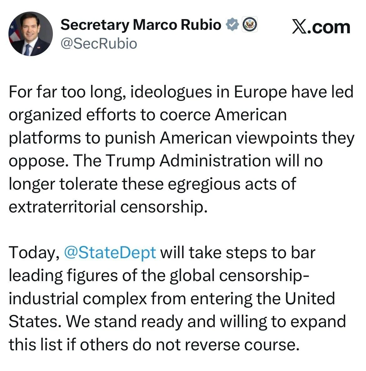 Госсекретарь США Марко Рубио объявил о намерениях страны ввести визовые санкции против европейцев, способствующих наказанию американских медиаплатформ за их неудобные мнения. Это заявление было сделано в социальной сети X.