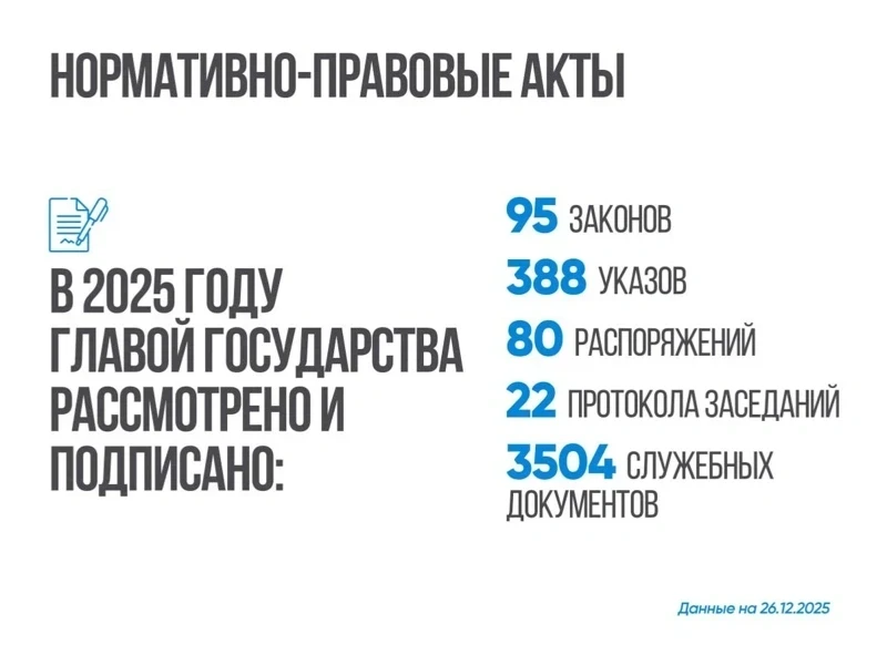 Президент подписал 95 законов, 388 указов, 80 распоряжений, 22 протокола заседаний и 3 504 служебных документа.