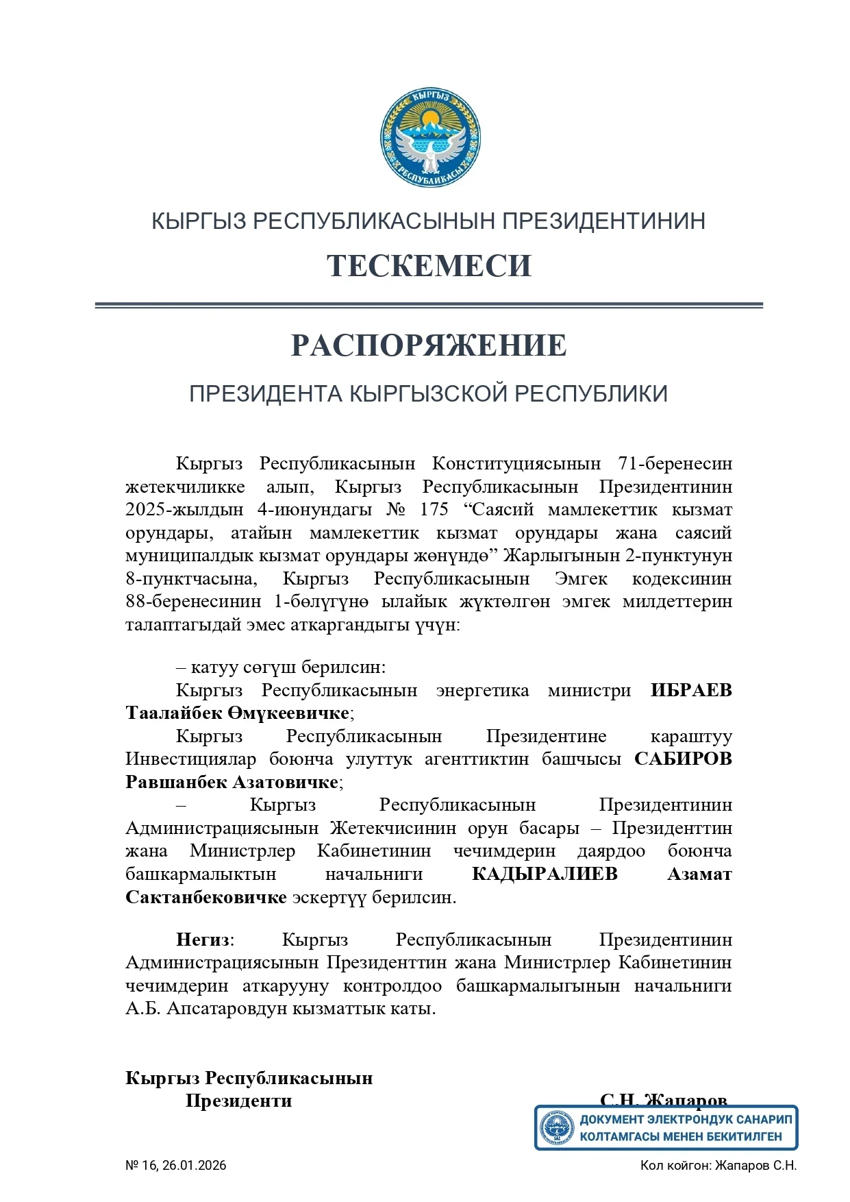 Заместитель руководителя администрации президента и начальник управления по подготовке решений главы государства и кабинета министров Азамат Кадыралиев получил замечание.