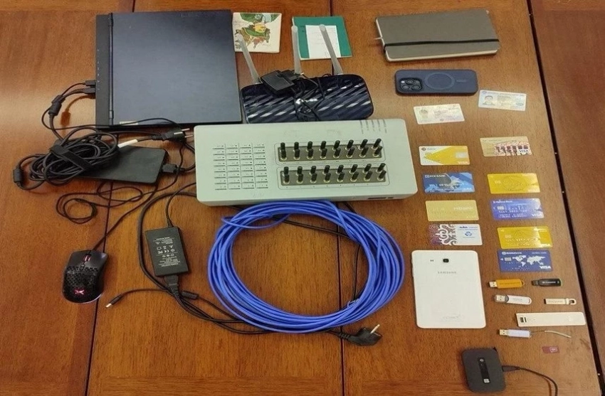 Кармоонун учурунда шектүүнүн жанынан 32 уячадан турган СИМ-бокс, алты USB флешка, Wi-Fi роутер, тогуз банк картасы жана ноутбук табылган.