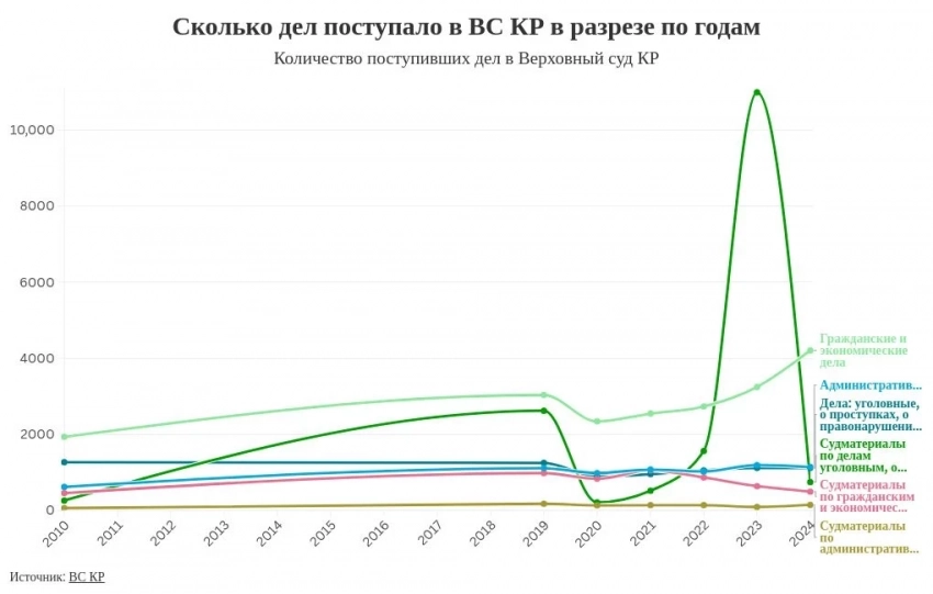 Мисалы, Бишкектин Ленин райондук сотунда 23 судья иштейт, 2022-жылы 14 783 иш жана материал келген, 2023-жылы - 15 304, ал эми 2024-жылга чейин - 23 500гө жетти. Демек, судьяга түшкөн ортосундагы жүк 53төн 85ке чейин өзгөрөт, бул белгиленген нормадан 35-65 бирдикке ашат.