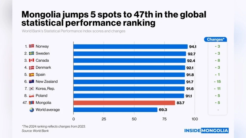 Монголия улучшила свои позиции в рейтинге Всемирного банка по показателям статистической эффективности, заняв 47-е место среди 217 стран. Это на 5 позиций выше, чем в 2023 году, когда страна находилась на 52-м месте.