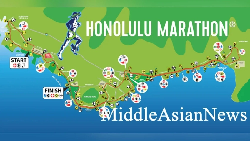 Старт марафона происходит в 5:00 утра на бульваре Ала Моана, где участников провожает впечатляющий фейерверк, освещая темные улицы Гонолулу.